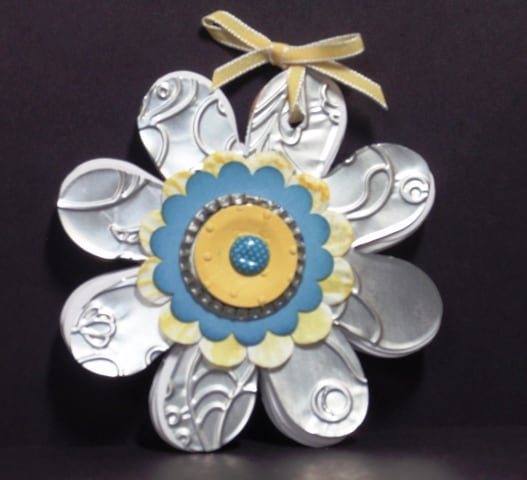 4. Run bottle cap through Big Shot machine between Standard Cutting Pads using Platform to flatten the cap. Punch hole in center using Crop-A-Dile. Layer this on top on the scallop circle. Run Daffodil cardstock through Big Shot using Polka Dot Embossing folder, then punch out one 1″ circle, and punch a 1/16″ circle punch in centre of it. Layer this on top of bottle cap. Layer all materials in step 4 on top of one aluminum flower. Punch through all layers in center through aluminum using the Paper Piercing Tool & Mat pack then insert brad and secure.