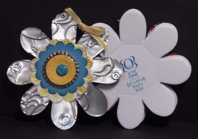 Did you know you can use many various materials other than paper with the Big Shot Die-Cutting Machine? Here’s a fun project that is unique – the covers of the flower-shaped note pad are from pieces of aluminum cans, and embellished with a flattened bottle cap! This project uses the inside (silver) part of the can, but it’s fun to experiment with various designs on the outside of cans too! Yes, it is safe to put both of these materials through the Big Shot! (Tip: use an old set of Standard Cutting Pads for the bottle caps, as they tend to leave deeper grooves than other materials do). Use copy paper, designer papers, or cardstock for the note pad filler.  What a fun way to Reduce, Reuse and Recycle!!!