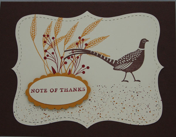 5) Stamp the Pheasant in Chocolate Chip Classic Stampin’ Pad onto the Very Vanilla Card Stock Top Note.