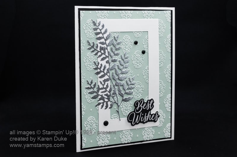 Accessories: Fern 3D Embossing Folder*; Natural Prints Dies*; Starry Sky 1/8″ Metallic Woven Ribbon; Rhinestone Basic Jewels; Stampin’ Cut & Emboss Machine