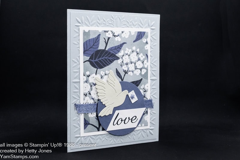 Accessories/Tools: Stampin’ Cut & Emboss Machine; Peace on Earth Dies*^; Peaceful Greenery 3D Embossing Folder^; Misty Moonlight & Silver Edged 1/2″ ribbon^; Hues of Blue Flowers^