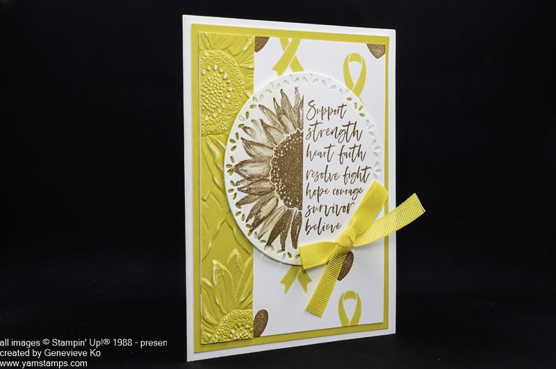 Accessories/Tools: Stampin’ Cut & Emboss Machine; Sunflower 3D Embossing Folder; Spotlight on Nature Dies; Darling Duckling 3/8″ Faux Linen Ribbon
