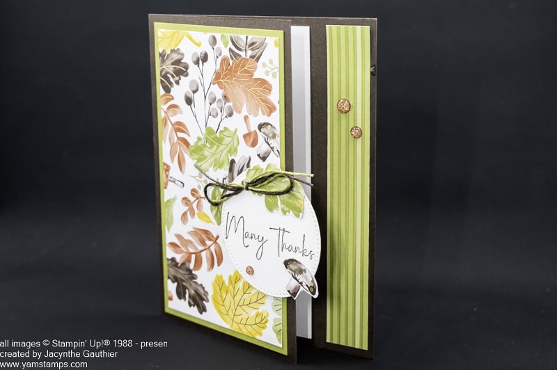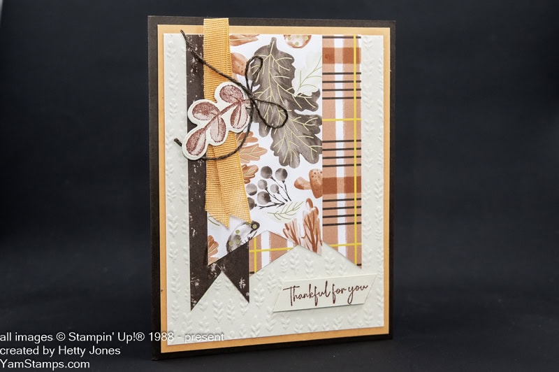 Accessories/Tools: Stampin’ Cut & Emboss Machine; Gathering Moments Dies*; Gathering Leaves Embossing Folder; Early Espresso & Old Olive Linen Thread Pack; Timid Tiger 3/8″ Faux Linen Ribbon
