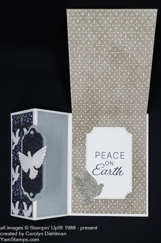 Accessories/Tools: Stampin’ Cut & Emboss Machine; Peace on Earth Dies*; Peaceful Greenery 3D Embossing Folder; Misty Moonlight & Silver Edged 1/2″ Ribbon